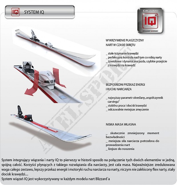 Lengths: 160 / 167 / 174 / 181 cm Sidecut: 121 / 73 / 105 mm - Radius 15,0 m (167 cm) Construction: Fiber Matrix Sidewall (IQ) - Woodcore, Quadrax TECHNOLOGIA: Suspension, IQ System, Sidewall, Tip Protector, Powerframe Camber: Full Camber Są to narty łatwe w prowadzeniu, mocne i stabilne. Szczególnie polecane dla tych miłośników nart, którzy kochają skręty o długich, czy średnich promieniach, a przy tym poszukują nart, które ich nigdy nie zawiodą. Na tych nartach możesz polegać w każdej sytuacji. Technologia Suspension jest aktywnym systemem wydajnościowym dla nart All Mountain, zapewniającym maksymalną stabilność oraz doskonały przekaz energii. KORZYŚCI - do 10 razy mniejsza wibracja - aktywne użytkowanie & kontrola - lepsze trzymanie krawędzi - większa dynamika jazdy - mniejsze zmęczenie
